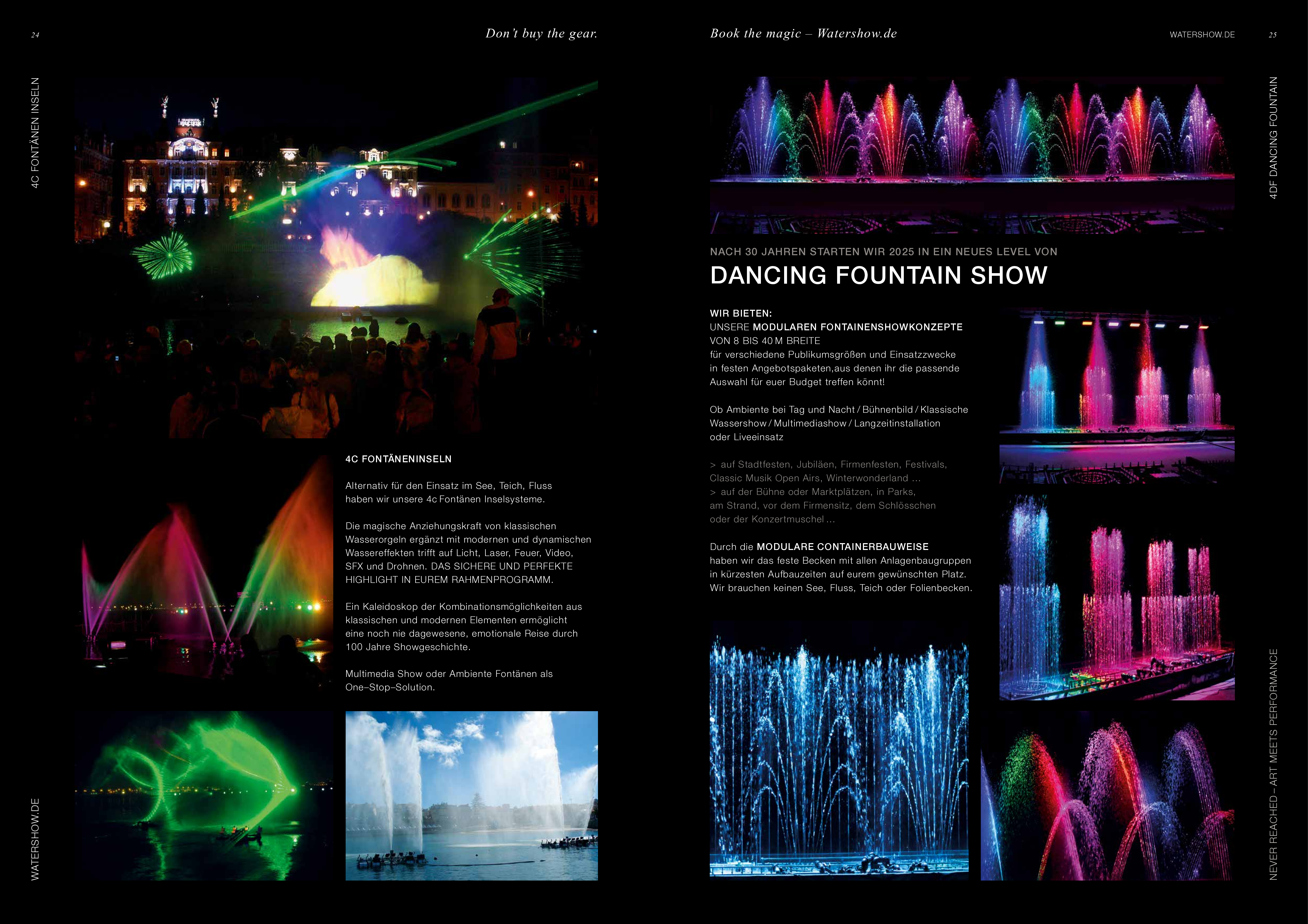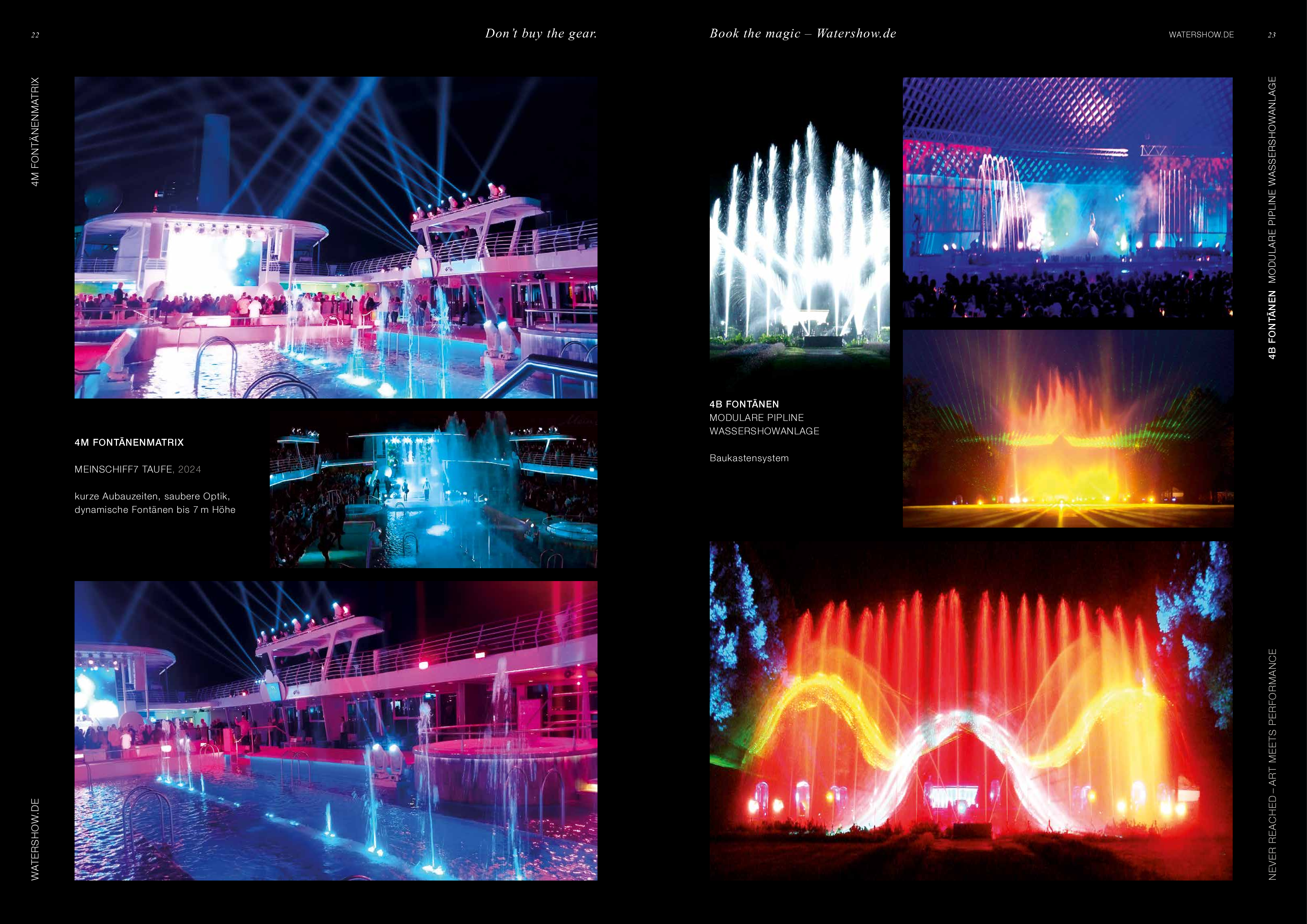Watershow.de GmbH verwandelt Wasser in unvergessliche Erlebnisse. Von funkelnden Fontänen und eleganten Wasserwänden bis hin zu hochmodernen Wasserscreens, die Logos und Bilder mit fallenden Tropfen schreiben. Jede Show ist ein einzigartiges Highlight. Mit individuellen Lösungen, perfekter Technik und beeindruckender visueller Wirkung lässt Watershow.de Marken erstrahlen und Events unvergesslich werden.